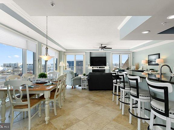 The Beautiful Rivendell Building in Mid Town Ocean City is the place to be ! This 2 bedroom, 2 full bathroom with a wall of windows that has views of Ocean city skyline and the bayside sunset views are stunning ! One floor living with a spacious floor plan that includes dining , living, and kitchen all open for entertaining. Kitchen granite, under cabinet lights, pantry, eat-in bar leads right into the living area with an inviting fireplace and 2 large sets of glass doors for endless views! The large deck with unbelievable ocean and bay views that will make you stay forever! Completely furnished and ready for the holidays ! Bayside pool and indoor pool, The Hobbit Restaurant for gourmet dining by Sunset !