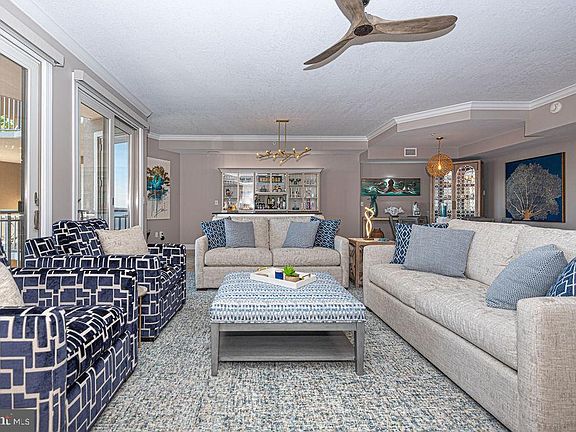 WOW, What can I say: THIS ONE IS FANTABULOUS!! NEW PRICE IS $899,900. A Truly unique, updated, freshly painted, 3 bedroom/2.5 bath. One of only three with a 2-level design in the prestigious Rivendell right on the Bay, but just one block to the beach. Over 2,000 Sq. Ft. including a GOURMET KITCHEN WITH GRANITE COUNTERTOPS, STAINLESS APPLIANCES, CERAMIC FLOORING ON FIRST FLOOR, NEW HARDWOOD FLOORING ON THE SECOND FLOOR. ALL furniture conveys with purchase. Over $100,000 in upgrades over the past 18 months. Enjoy sunsets from either floor on stretched balconies on higher end outdoor furniture. First floor living gives you a wonderful entertainment area including the magnificent kitchen, plenty of new built-ins including a beautiful bar, and plenty of open space so family and friends can enjoy themselves. Remote control window shades on the first level. A custom fireplace finishes off the living area. The second floor has 3 large bedrooms and a separate laundry room. The primary bedroom is bay front and has a spacious bathroom with a large soaking tub as well as the shower. The Rivendell has an excellent fitness room, an indoor AND an outdoor pool, and the adjoining world-class Hobbit Restaurant. 2022 new dual HVAC systems and 2021 hot water heater and washer and dryer. There is a reverse osmosis water filtration system on kitchen sink and the two full baths upstairs have water treatment systems on the shower heads.
