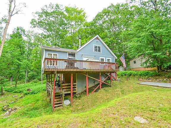 MOTIVATED SELLER! 3 bedroom Chalet Style home located in the quaint community, Marcel Lake Estates of Dingmans Ferry. This great property is tucked away at the end of a Cul de Sac backing up to wooded land. Just a short walk to Marcel Lake and park and not far from the clubhouse, pool and tennis court. Features include vaulted ceilings, an open kitchen and dining area, foyer entrance/ den with wood stove, and a large living room with French doors. Two bedrooms, full bath and laundry room complete the main level. Upstairs, there is an open loft/ 3rd bedroom overlooking the first floor. The full basement offers high ceilings, plenty of storage and a walk out to the covered deck. Entertain or relax outside on the expansive 2nd story deck! Plenty of off street parking. HOA ammenites include beaches, clubhouse, playgrounds, outdoor pool, tennis court, garbage service, road maintenance and gated security! Perfect for a vacation getaway or year round living! No short term rentals allowed.