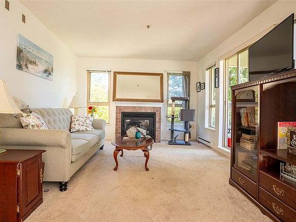 Welcome to this spacious south-facing 2-bedroom, 2-bath CORNER unit in the desirable 55+ community of Silverwood at Thetis Cove. With 1,072 sq ft of well-designed living space, it offers a bright, functional layout, generous room sizes, and an inviting gas fireplace. The kitchen features ample cabinetry, an eating nook, and access to the dining area—ideal for daily living and entertaining. The primary bedroom includes a walk-in closet and 4-piece ensuite, while the second bedroom suits guests or a home office. Enjoy your large covered balcony with space for seating and plants. Additional features include in-suite laundry, secure underground parking, and access to an exercise room, games room, workshop, guest suite, and greenhouse. Steps from shopping, dining, transit, and Thetis Lake trails, and within walking distance to the Gorge Waterway, this home blends comfort, convenience, and community living.