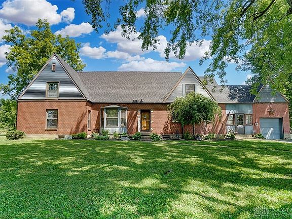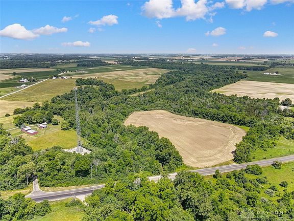 Lovely 4 bedroom 2 bath Brick home on an amazing 55+ acre property!! Located outside Eaton and surrounded by woods and farmland, you'll be impressed the minute you pull into the circular drive . Nice tiled entry leads to the living room with a large bay window, brick hearth and wood burning stove and wood floors that continue throughout most of the 1st floor . The dining room is open to the living room and has a large picture window with view of woods, plus wainscoting. The kitchen has tons of cabinets, an extra large pantry, stylish backsplash and a breakfast room. The huge 1st floor master bedroom and a full bath with built in storage and extra deep tub. Upstairs are 3 bedrooms and full bath plus a hall large enough for lounging! Outside you'll find 5 outbuildings: a 48 x 24 Pole Barn, a 32 x 28 stable, 2 smaller sheds, one with a lean to and a small guest house that needs rehabbing. Property has a woods, Bantas Creek and farmable land. The half acre w/a cell tower sells separately for $200,000, currently leased for $1,064.80 monthly. Approx. 15 years left on the lease. 25 acres are currently leased for $3,150.00 yearly. Currently no fencing on the property. Newer roof, HVAC fall 2014, water heater 2015.