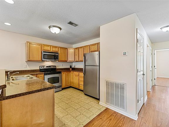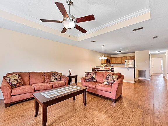 Affordable, easy living near NSB Kings Bay in this 3 bedroom 2 bath, lakefront home: Open floor plan, fully equipped kitchen with smooth top stove and microwave above, abundant counter space, spacious breakfast bar, dining room/ living room combo. Screen porch of the living room overlooks the community lake. Owners bedroom has private bath and walk in closet. This home has wood laminate floors in living areas, dining and 2 bedrooms. Other features include: 1 car garage, interior laundry room with cabinets, neutral colors throughout, gracious sized yard, no HOA. Easy to show, move in ready!