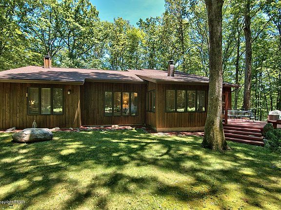 Serenity awaits. Tucked away on beautifully wooded grounds that back up to State Gamelands. Fabulous ranch with 3 bedrooms, 2 baths, 2 car garage and circular driveway. Kitchen with cherry cabinets and floors, stainless steel appliances, family room with Swedish soapstone stove, toungue & groove ceiling in sunroom, sliders to spacious deck, finished basement with wet bar and office all on a double lot totaling 2 + acres. Minutes to Route 80.
