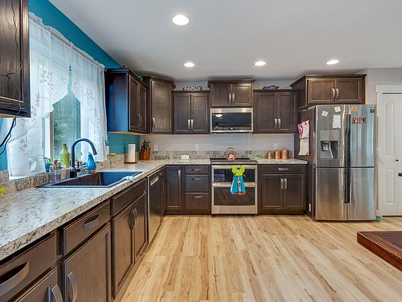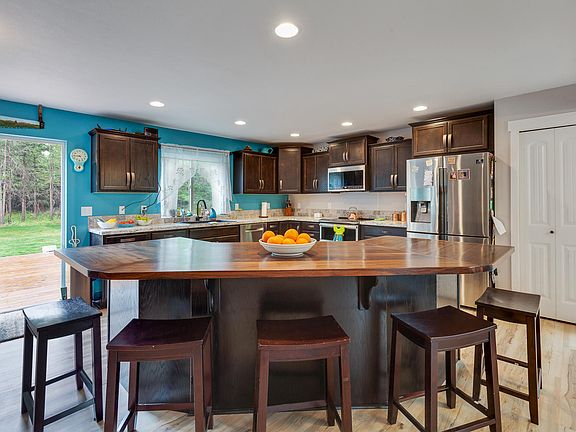 Why wait for new build? This custom home was completed October 2019. 5 bedrooms, luxury vinyl planking, farm sink, oversized windows, generous size living area and additional upstairs living room. Enjoy this very private 5 acres with 1/3 property parked out, water feature, fenced garden area, perennials, and fruit trees. The 20 x 50 lean-to is snow rated and there is plenty of room for a shop. High-speed internet provided by Air-Pipe. Please see detailed feature list.