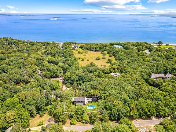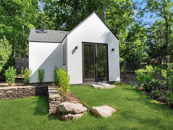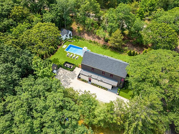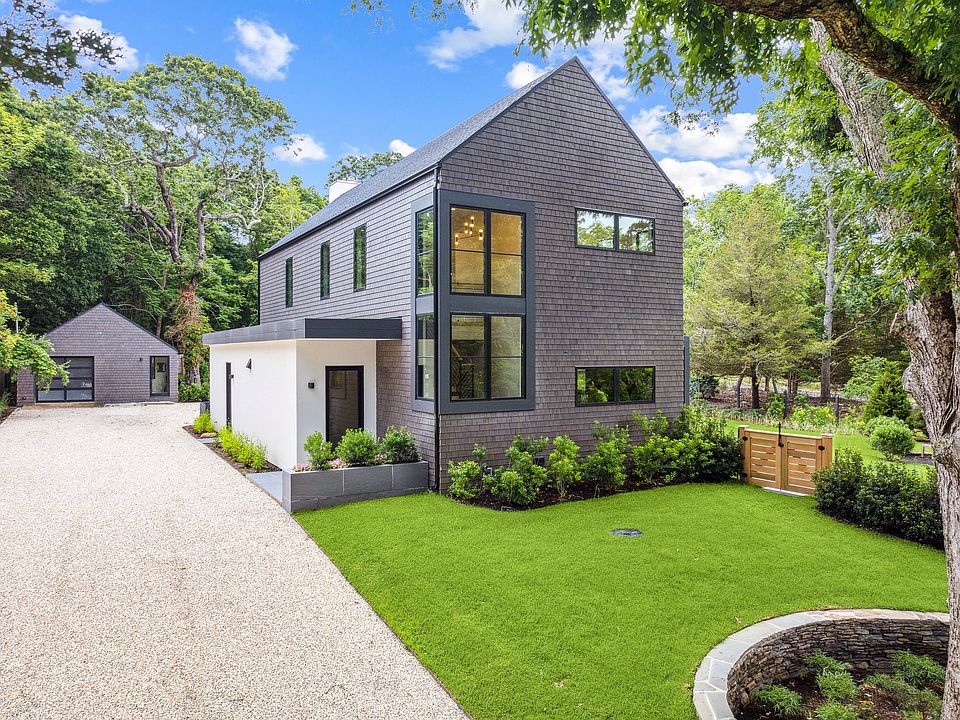 With Barnes Hole Beach under 1,000 feet away, this brand new stunning modern home has a detached garage with a fully finished bonus room, as well as a super quaint, gut renovated, guest cottage with a lounging/sleeping area, kitchenette, and full bathroom, which majestically overlooks the pool and yard. The first floor of this newly constructed modern home features a great open floor plan with 10' ceilings, where the living room with fireplace, dining area and kitchen are all integrated to keep everybody in touch. At opposing ends of the first floor are a half bath and large den with pocket doors that conveniently close for extra guest space. The contemporary wood and steel staircase to the second floor passes a wall of windows before arriving at two spacious light filled guest bedrooms with a bathroom followed by the ensuite primary bedroom and walk-in closet. Sliders from the first-floor lead to a covered bluestone patio with fans to keep you cool while dining or just enjoying the tranquility of the backyard. Off the patio is a spacious lawn that leads to a gunite, heated, saltwater pool with lovely landscaping designed by a prestigious local landscape architect. In the northwest corner of the property there is a serene sitting area with a fire pit for when the night air begins to chill. With Barnes Hole Beach, one of the Hamptons best secrets, only a stone's throw away, and a spectacular new home with two bonus outbuildings, you will want this home and neighborhood to be yours.