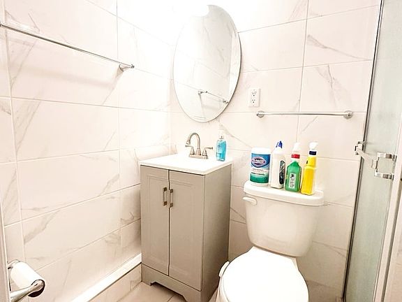 The bathroom has all new tiles on both the floors and going all the way up the ceilings with a spacious walk-in shower.