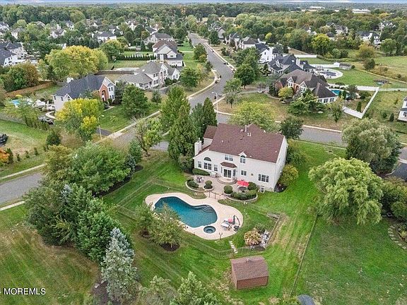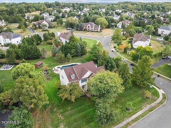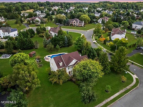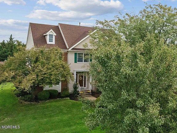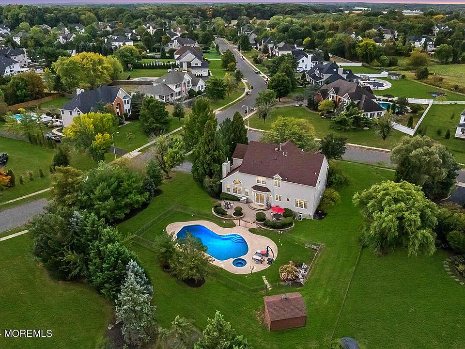 Welcome to this exquisite brick-front Colonial in the coveted Seven Oaks development in East Freehold. Original owners have spared no expense, ensuring every corner of this home is filled with thoughtful upgrades and premium amenities. As you step through the impressive two-story foyer, you'll be greeted immediately with grandeur. The main floor boasts a versatile layout, offering a private first-floor office/bedroom—perfect for work-from-home needs or guest accommodations, an impressive formal living room, and an entertainment-sized dining room with tray ceiling. The spacious eat-in kitchen features recessed lighting, center island, and elegant granite countertops overlooking the expansive great room, where a dramatic vaulted ceiling and cozy wood burning fireplace make it the perfect spot for relaxation or entertaining. An updated powder room and a large laundry/mudroom with custom built-ins complete the first level. Dual Staircases lead to the upper level, featuring generously sized bedrooms, each offering comfort and privacy. The gorgeous, fully renovated main bathroom offers modern finishes and high-end materials. Retreat to the primary suite, which includes a double-door entry, vaulted ceiling, relaxing sitting area, and a spacious walk-in closet. The luxurious ensuite bath invites you to unwind with a jacuzzi tub, a separate shower stall, and dual vanities adorned with granite countertops. A fully finished basement with a full bath, media area, and gym provides additional living space and entertainment. Step outside and enjoy your backyard oasis, professionally landscaped with an irrigation system, paver patio, shed, two-car side entry garage, and fully fenced Gunite heated, saltwater pool and spa. Ideally located to all major highways, NYC transportation, shopping, and top-rated school system. Don't miss the opportunity to own this exceptional home in one of Freehold Townships' most prestigious communitiesA PERFECT 10!