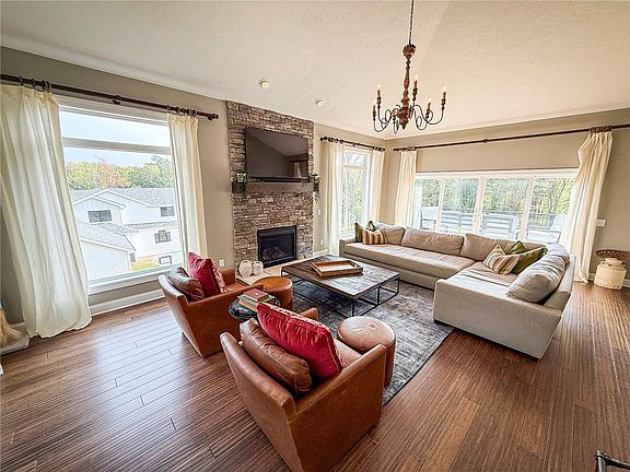 Stone fireplaceNewly installed in-ground poolWalkout game roomUpscale lightingStep-down entertaining deckMain-level officeUpper-level balcony