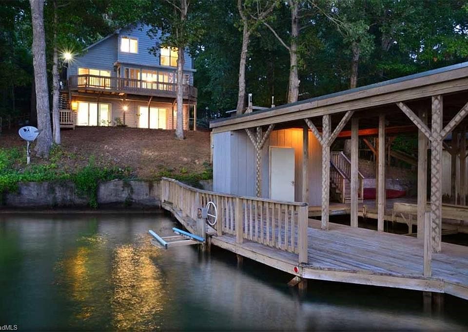 A fabulous location with big water views & level lot. lots of glass, cathedral ceilings, sunroom, master suite & great room. Wonderful open floor plan with huge main channel view from balconies, decks & sunroom. basement & large boathouse w/slips. 2 car garage. Seller just replaced all the flooring on the 1st & 2nd floors. We now have wood flooring, new linoleum, in bathrooms, & new carpet!