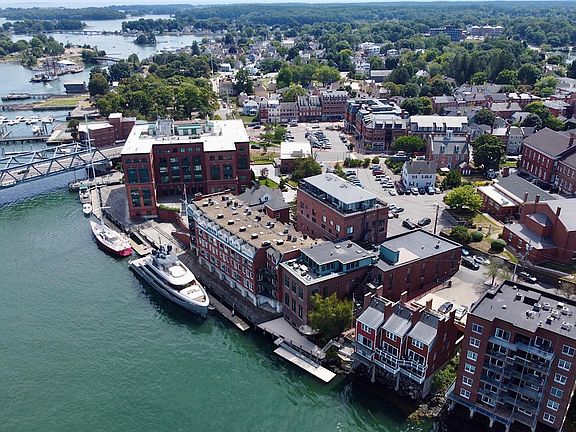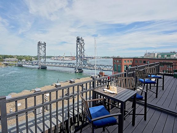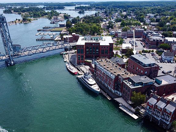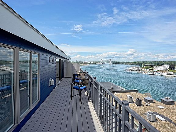 Picture yourself living in the heart of Portsmouth, just a short stroll along brick sidewalks to a myriad of fine dining, boutique shops, concert venues, Market Square and Prescott Park. Imagine waking each morning and enjoying your coffee on the expansive deck with commanding views of the Piscataqua River, Badgers Island and Memorial Bridge. Coastal breezes scintillate the senses, the ever-changing vista on the River never gets old. Walls of windows and sliders invite in natural light and provide a seamless transition to the open concept layout, perfect for entertaining indoors and out. Enjoy the epicurean inspired kitchen with custom cabinetry, striking granite countertops, and stainless steel appliances. Cozy up with a good book near the warmth of the gas fireplace on cooler evenings. Exposed brick walls and high ceilings grace the two en-suite bedrooms. The tranquil primary bedroom features a wall of closet space with custom shelving. Calming water views from the jetted tub and tile shower inspire relaxation. This unique property and stellar location inspires a coastal, urban lifestyle surrounded by the historical charm and cultural vibe of Portsmouth.