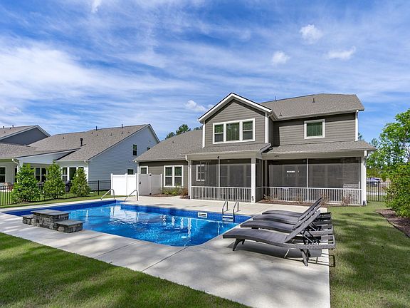Well appointed, arts & crafts southern charmer stands out among the Triangles most impressive residences filled with upgrades utilizing the finest materials. Custom trim work, plantation shutters and blinds. Crown molding and engineered hardwoods throughout with tile in bathrooms and laundry. Elegant private study or formal living, open living floorplan with gas log fireplace, chef inspired kitchen with WI pantry, 2 master suites - one on each level, office nook, epoxy garage floor, front yard irrigation and much more! Wrap around screened porch with incredible stone fireplace links the main house to exceptional outdoor living in your very own fenced-in private oasis with luxury pool and water feature! Nestled in a highly sought after community with pool, dog park, playground and trails.