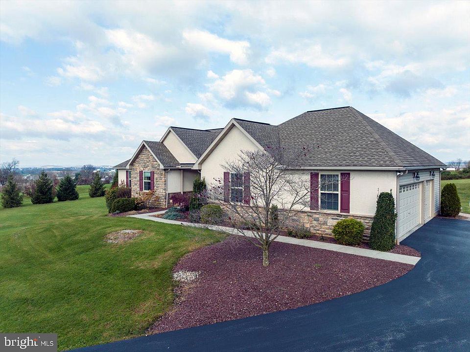 Absolutely exquisite property. Views for miles. Visit this 2010, European Homes-built, ranch-style home located on over 2 picturesque acres. Main floor living offers 3 bedrooms and 2 full baths with spacious kitchen and pull up bar peninsula. Breakfast nook addition added. Large living room with vaulted ceilings, wood floors and propane fireplace. Primary bedroom suite with walk through closet and full bath with jetted tub. You're going to love the walk out finished basement offering an additional 1400 sq feet of finished living space. Basement is divided into 3 rooms: a large family room, bedroom/craft room and a mechanical/storage area. Pristine, 3-car, side-entry, oversized garage. Home sits on a beautifully landscaped lot with a composite deck and a paver patio.