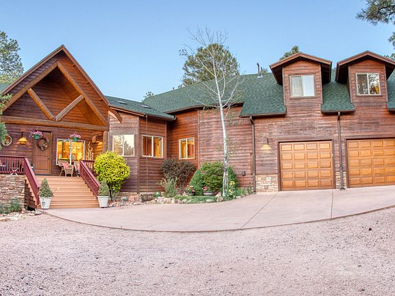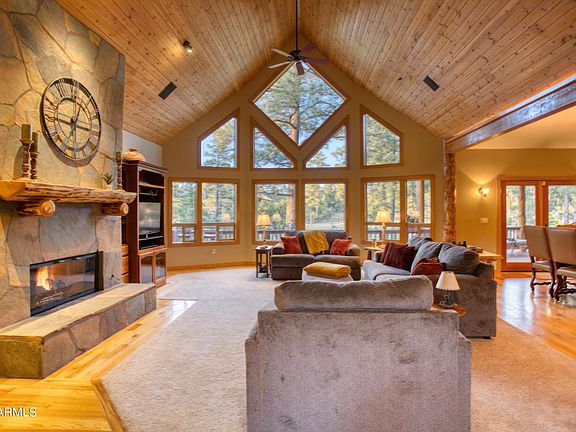 As you enter the front door you are greeted with floor to ceiling windows overlooking the 13th tee box and towering ponderosa pines. At night, the sounds of nature are abundant and relaxing as you sip wine or hot cocoa from your full length deck with 1/3 of it fully covered. Over $175K worth of included, cabin themed furniture such as decorative bear sofa tables, bear themed drapery rods & even custom poker chairs w/ bear themed upholstery are throughout. Vintage jukebox to play your favorite classic hits or enjoy surround sound on walk out deck or inside of family room. 3/4 inch oak flooring, a grind master, Stream Labs System, Tankless Water Heater, Lennox AC, professionally installed gutters, city sewer, skylights in kitchen and main master, alarm system, pre-plumbed wood stove in main master, cozy gas fireplace in Family room and built in office make this the ideal work from home paradise.....