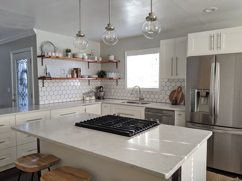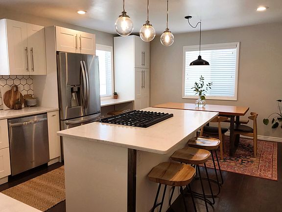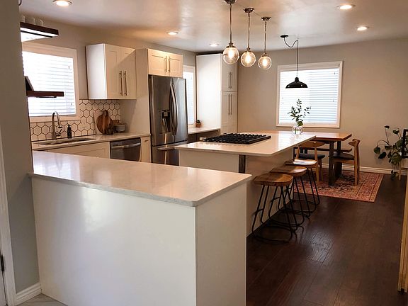 Gorgeous single level 3 bedroom, 2 bathroom home with an open layout and new modern kitchen remodeled with stainless steel appliances, walk-in pantry, soft-close cabinetry and quartz countertops. This home boasts a quaint circle drive, automatic sprinklers in front and back, a 2-car garage with workbench, oversized shed, and a dreamy fenced-in backyard with gas fire pit, and concrete patio perfect for entertaining. The 1,584 square feet include fresh paint, crown molding and a corner fireplace in the living room as well as a large master suite that opens to the backyard, a spacious 3rd bedroom, and marbled tile entryway flanked by engineered hardwood flooring throughout the main living areas and master suite. Superb location, managed by snowplows in the winter and walking distance to a lovely park.