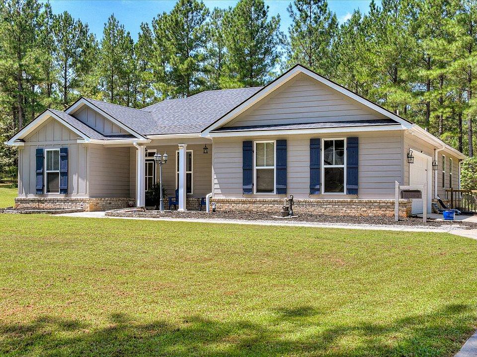 Better-than-new 4 bedroom home on 2.3 acres! Located in The Ridge in north Burke County, this 1,824-sq ft home has continuously been improved since its construction in 2018, with extras such as discretely placed solar panels (plus whole-house energy efficiency upgrades) that mean big $ off your power bill. With an open concept, split floorplan, the single-story design features an efficient flow, vaulted ceilings in the living room and 3 bedrooms, and lots of natural light. Kitchen offers granite counters, tile backsplash, beautiful apron-front farm sink, counter-height island with seating and a pantry. Primary suite features large walk-in closet and ensuite bathroom with garden tub and double vanity (with granite). Across the home, find 3 bedrooms and a spacious hall bath. (Special bonus: A custom reading nook and personal library tucked away in one of the bedrooms!). Outside the home, you'll find covered front and back porches, gutters around home, extended concrete driveway and parking pad, sprinkler system, 24x24-ft concrete pad ready for a shop or outbuilding, and fenced area for pets (with custom dog house). Enjoy plenty of space, privacy and the benefits of country living without sacrificing convenience. No HOA. Must see!