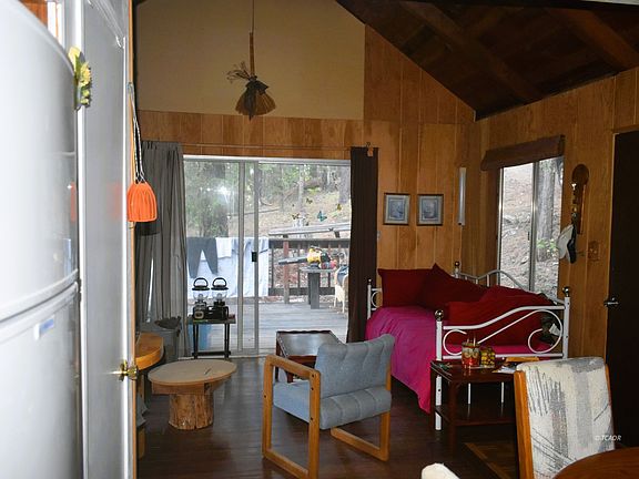 This adorable 2 story, 1 bed/ 1/2 bath, 580 sq ft cabin with wrap around decking on 3 sides, sits on 2 developed acres, in a quiet neighborhood in the Trinity Pines. It has been a well-loved family vacation property for the past 40 years and is built solid on a granite slab with Hardie board cement siding The property features a split driveway for plenty of parking and a large carport for RV parking or other outdoor entertaining. The home comes fully furnished and sleeps 5 adults comfortably. There is a wood stove for heat as well as a great producing well that produces roughly 16 gpm (per seller) and runs by way of generator. The home is plumed for propane for the stove and oven range and is on a septic system for sewer. There is a pop-up canopy with sidewalls included that is used for the outdoor shower system as well. The property is gently sloped with plenty of room for gardening or developing further. This would make a great place to call home or to have as a continued getaway cabin in the famous Trinity Pines!