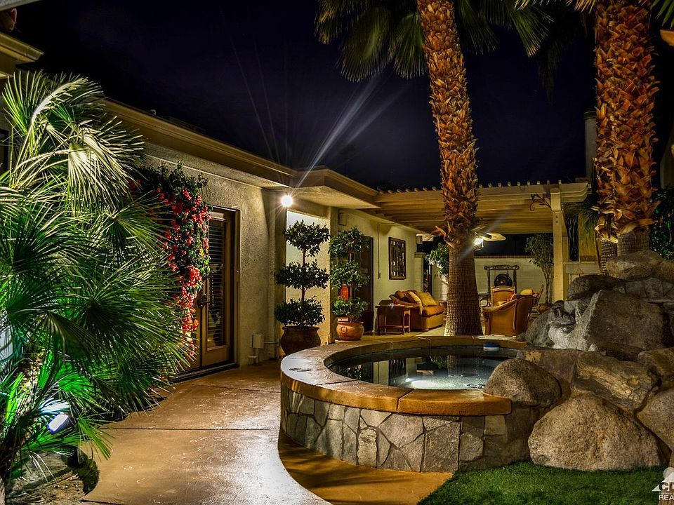 This is a one of a kind 4000 plan. Over 2470 sq.ft. free standing with no common walls and a gorgeous side yard with built in spa, outdoor fireplace and a large seating area. In addition the separate patio has a gas BBQ, fire pit and even more seating area. the entire outdoor area has a recently completed upgraded walkway and deck of designer concrete. Inside the custom remodel includes redone kitchen, bathrooms, granite counter tops and newer flooring throughout. The third bedroom has been converted into an office and the atrium has been converted to a formal dining room with a separate breakfast room off the kitchen. The Master bedroom has been converted to a suite with seating area and a remodeled bathroom with a full walk in closet. All the custom furnishings remain along with many decorator items. a list of those items not included will be provided. You must see this beautiful property with all it's many amenities.