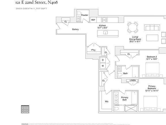 Welcome to residence N408, urban luxury at its finest in the heart of historic Gramercy. Elevated features in this thoughtfully designed 2 bedroom, 2.5 bathroom, includes oversized windows, wide plank white oak hardwood floors, custom closets and high-end finishes throughout. The expansive foyer welcomes you with custom closets and a chic powder room with floor to ceiling marble. The generous open living room leads seamlessly into a high-end chef's kitchen equipped with sleek custom cabinetry, polished quartz countertops and Gaggenau appliances. Enjoy a generous primary suite with ample closet space including a large fully fitted walk-in. The lavish primary bath is outfitted with Calacatta Paonazzo marble, white oak cabinetry, polished chrome Kallista fixtures, acid etched glass shower doors and radiant heat flooring. Additional highlights include 7 large closets, full size washer and dryer, Lutron lighting, and Sonos sound systems. 121 East 22nd Street is a full-service, high-amenity premier Toll Brothers building, the first residential building in NYC designed by world-renowned architectural firm OMA. Residents will enjoy a carefully curated selection of amenities that includes an indoor pool, a landscaped courtyard, an indoor/outdoor residents' lounge, a rooftop terrace with fire pit and grill, a private dining room and catering kitchen, a fitness center, a screening room, and a children's playroom. The building also offers an automated indoor parking system, bike storage, private storage, a 24/7 attended lobby, and full concierge services.
