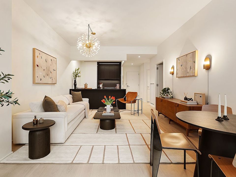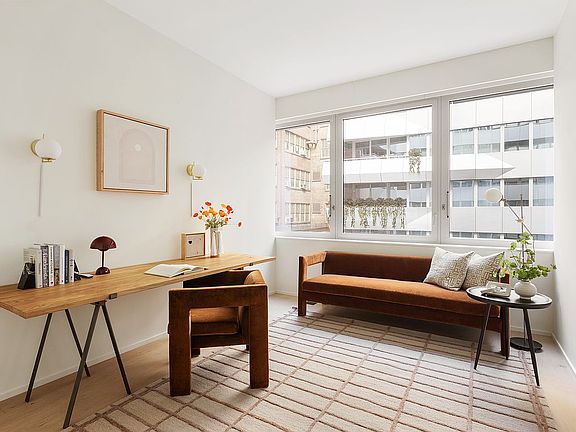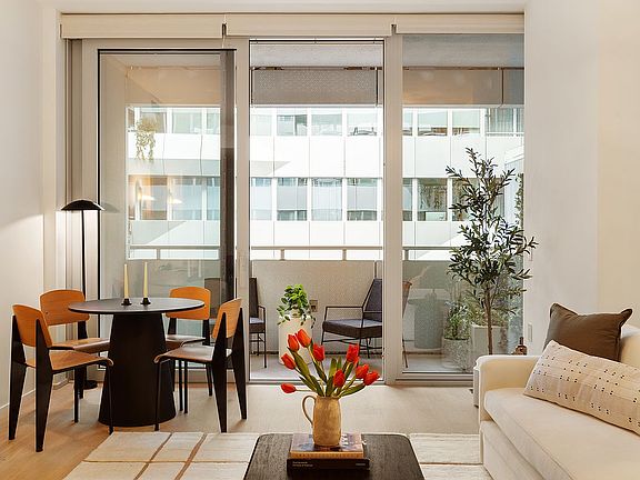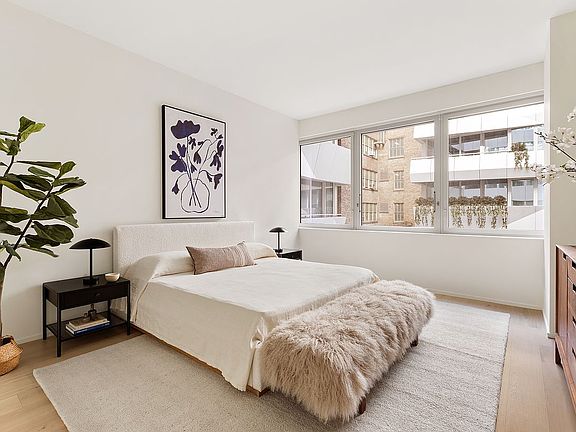 This stunning 2BR/2.5BA home offered with beautiful high-end furnishings, features southern exposure, a 79SF balcony, 1349SF of living space, 9'9' ceilings, and generous closets. As you enter the apt, the open layout living room and kitchen flow seamlessly with floor-to-ceiling sliding doors allowing light to fill the rooms. It is the quintessential urban oasis with a serene outdoor space overlooking a private landscaped courtyard in the heart of the best neighborhood in NYC. Both bedrooms are en-suite and easily accommodate king-size beds. The expansive primary bedroom suite has room for an office/seating area and includes an oversized walk-in closet plus an additional shoe closet. The stunning primary bathroom clad with Calacatta Paonazzo marble countertops, tub decks, and accent walls is outfitted with radiant heated floors, white oak cabinetry, polished chrome Kallista fixtures, and acid-etched glass shower doors. The home features wide plank, white oak floors, Gaggenau appliances, polished quartz countertops, and back-painted glass cabinetry with custom millwork interiors.