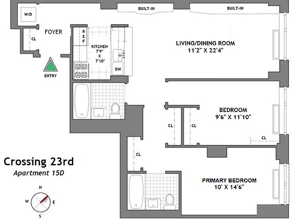 SUN-FLOODED HIGH FLOOR TWO BEDROOM STUNNER Off Park Avenue South, where Gramercy meets the Flatiron and Kips Bay neighborhoods, come home to Crossing 23rd, a full-service condominium with doorman, concierge, fitness room, lounge with outdoor landscaped terrace, bicycle room and resident manager. Enjoy wonderful open North and East views through the 23 foot living room's floor to ceiling windows. There is ample space for formal dining and storage from two wood built-outs, one with a mirrored buffet and glass display shelving. The open kitchen has granite countertops with breakfast bar seating for four, rosewood cabinetry, and a suite of full-size stainless appliances. There are two oversized bedrooms including a well-laid out king-size primary featuring a dressing area with two double wide closets and sleek en suite bath with textured wall tiles, natural stone floors and tub with rain shower head. Perfectly situated off the hallway is a full bath with marble top vanity. Additional niceties include a charming foyer with coffered ceiling and plentiful storage, including a utility closet with stacked Bosch washer and dryer; wide plank Brazilian cherry hardwood floors; base moldings; and Lutron dimmers. Newly installed central heat and air conditioning units. Spectrum Gold cable package included. Residents covet their central Gramercy Park location, with proximity to bus and subway service, Madison Square Park, grocers Trader Joe's and Whole Foods, and dining including as Eataly and Gramercy Tavern. This immaculate apartment was featured on our hit HGTV show 'Selling New York,' now streaming, and is being offered unfurnished for a minimum one year lease term. No pets permitted. Condominium Fees payable by Tenant: $75 Credit Check (per Adult Occupant) $700 Application Processing Fee $112.50 Document Production Fee $750 Refundable Move-In Deposit