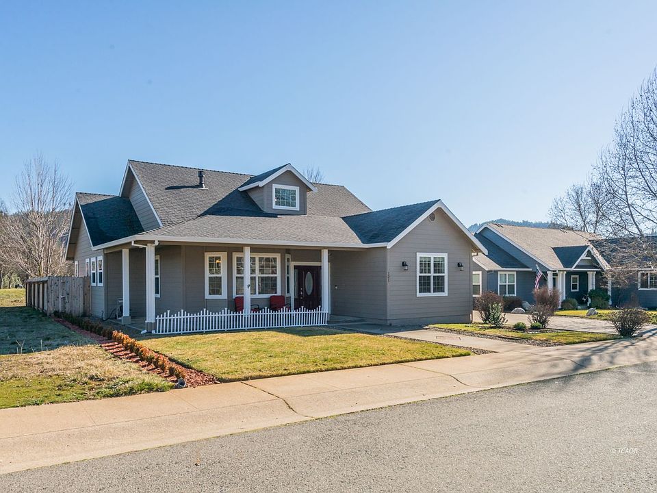 This distinctive home that borders the Trinity Alps Golf Course in Weaverville, this 3 bedroom, 2 full baths,that consist of 1,860 sf of living space, coming inside the home is the grand foyer with tile flooring, an elegant living room with gas fire place, leading down the foyer will open up to the great room, that offers the kitchen, dining and family rooms. Kitchen comes complete with hickory cabinets, stainless steel appliances, custom lighting and a convenient island. Dining area has slider leading to the completely fenced in back yard, family room has a wall of windows to let in all the natural light and 2 sky lights.There are two guest bedrooms at the front of the home and the primary bedroom is at the rear of the home, the primary bedroom offers a walk-in closet, and the primary bathroom comes with tile flooring, dual vanities & tile shower, the guest bathroom also offers tile flooring. Leading out thru the laundry room you will find Hickory cabinets, over-sized sink, washer & dryer, that also leads to the attached two car garage.Backyard has a patio area and decking area with a pergola for enjoying all of your back yard BBQ's and entertaining. Very desirable neighborhood