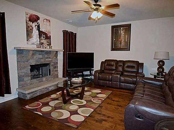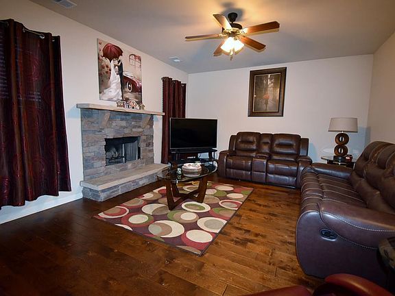 Looking for a spacious home with a HUGE owner suite? You found it! Downstairs, you get hardwood floors, wainscoting, and crown molding throughout. Hosting family get togethers will never be a problem with formal dining room, bonus sitting room, stone fireplace and an amazing kitchen, complete w/island, granite counters, tile backsplash, pantry, and sleek black appliances. Upstairs, the approximately 520 sqft. owner suite has vaulted ceiling w/ceiling fan & enormous walk in closet, plus private bath w/ceramic tile, dual sink vanity, separate shower, soaking tub & water closet! Three great size guest bedrooms each w/vaulted ceilings plus Jack & Jill bathroom! Laundry room conveniently located near bedrooms. With two car garage and 10' x 16' storage building included, storage will never be an issue. The covered back porch and large backyard are perfect for those weekend cookouts with the family. Schedule your showing today!
