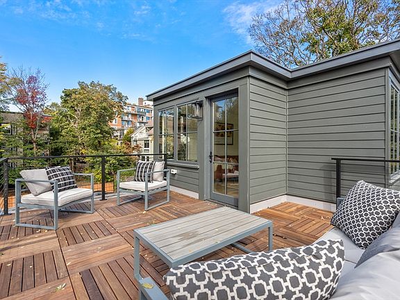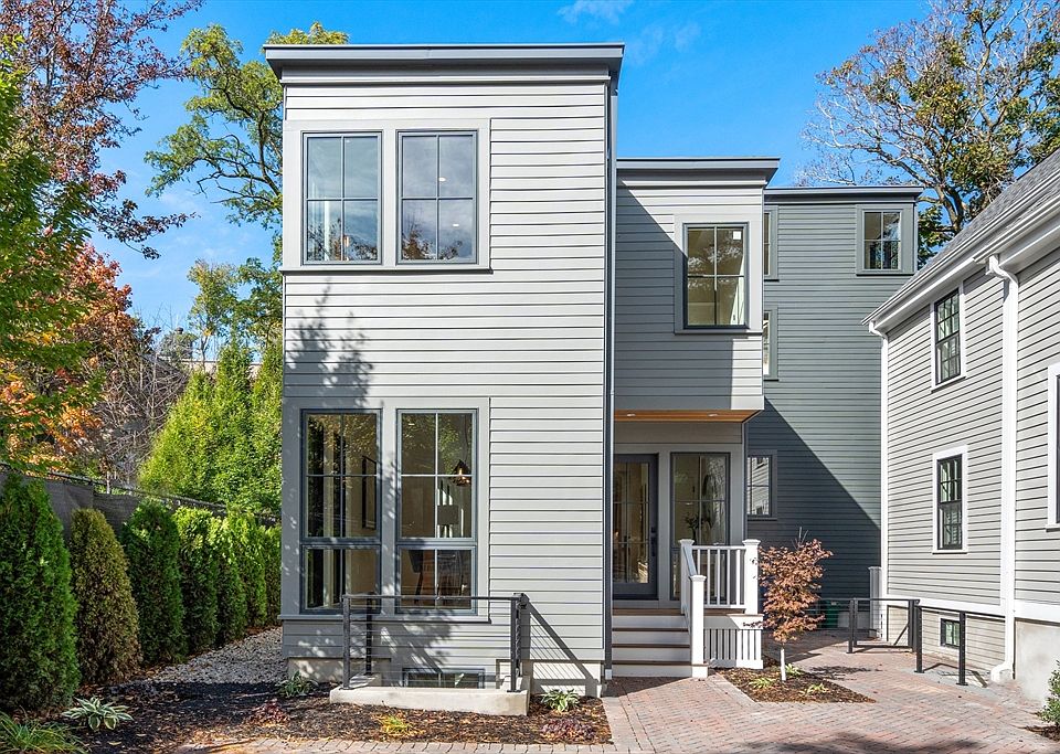 Constructed from the ground up by a premium Cambridge builder, this sleek contemporary home stands alone tucked in an enclave of evergreen trees. Everyday is a happy day if you live here. Through the foyer, the airy living room offers a built-in bar and flows into the dining room. The chef's kitchen showcases custom cabinetry, high-end stainless-steel appliances, stone countertops, an island, and access to the lush private backyard. There is also a bedroom/study with an en-suite bath and an additional bathroom on this floor. Upstairs, the primary bedroom offers an outfitted 12' walk-in closet, and spa-like en-suite bath with a double vanity and soaking tub. There are 2 more bedrooms, a hall bathroom, laundry and utilities on this floor. The top level houses an exceptional office/bedroom with an en-suite bath and access to the private roof deck.