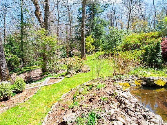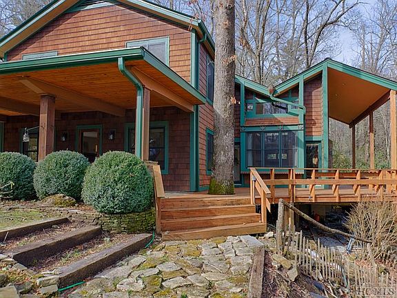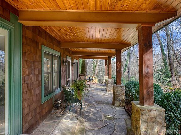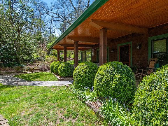 Walk to town from this well-maintained and low maintenance rustic chic cottage with new A/C system in place! Old Highlands charm with one of the prettiest yards in Highlands with flora, fauna and lush green space galore! Linger at the huge stone fire pit or rock your cares away on the covered porch! An stunning architecturally designed window is framed by wooden walls and glass in the den with a stone fireplace and built-in bookcases and hardwood floors. A separate great room boasts a double-sided fireplace that is exposed to a sun room with walls of windows allowing natural light and views of old moss covered rocks and a large fire pit for gathering with friends on chilly evenings. With a large and almost level yard, this allows for furry friends to have their own play space. Or if you enjoy gardening there is plenty of space for perennials and herbs...