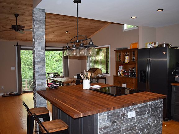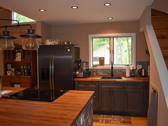 So peaceful and quiet listening to the river, park like land with 3 levels of decks to enjoy the outdoors. Home has been totally rebuilt with new floors, ceilings, kitchen and reconfigured to provide an easy open flow. 3 Bedrooms, one on each floor, Laundry hookup and Full bath on main floor. Multiple out buildings, garage, work shop, one could be a future guest room or !the perfect kids play house or a He/She Shed? Enjoy fresh veggies from the fenced garden with Pex watering system. Insulated for year round use, drilled well, modern septic, back up 'generac' generator. This is Move in Ready! Located on a Town maintained dead end road. You can walk to the golf course, trails and excellent restaurant! Looking to escape the world? Look no further!