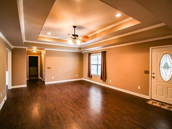- LIVING ROOM DESC: Crown Mold, Window Cov, Laminate Floor, Ceiling Fan, Trey