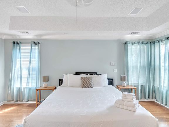 Welcome to this spacious four-bedroom, two-bathroom residence located at the end of a quiet cul-de-sac. Feel at home with easy access to Historic Savannah and downtown, while being less than three miles from the Botanical Gardens and just 35 minutes to Tybee Island Beach. Thoughtfully furnished for your comfort, this home ensures a reliable stay with a pool available year-round. The front entrance leads into a foyer with stairs to the upper floor and a hallway to the living area. The living room features a queen pull-out couch and a 50" Roku TV. Adjacent is an eat-in fully stocked kitchen with a separate dining area that seats eight, along with a half bathroom. Upstairs, find four bedrooms: one with a king bed and ensuite full bathroom with garden tub and shower and walk-in closet, three queen bedrooms, and another full bathroom with tub. Note that two bedrooms are connected, requiring passage through one queen bedroom to access the second. The backyard includes a pool, seating, and grill. Guests will have full and private access to the entire home, yard, and pool. A $50 pet fee is required, and pets must be crated when left unattended. Pets are not allowed on furniture or beds, and all waste must be cleaned from the yard. Additional cleaning fees apply if pet hair or waste is found. Weekly maintenance and cleaning are performed on the pool, requiring access to the yard on service days. Nestled in the tranquil Cresthill neighborhood of Savannah, this home is located on a cul-de-sac. While the area is not walkable to local attractions, driving is recommended, and Uber and Lyft are readily available. This home offers contact-free check-in, and we are just a message or phone call away if needed. No parties or events are allowed, and quiet hours are after 10 PM. No smoking, no glass in or around the pool, and no pets on the furniture. A signed rental agreement is required, and guests must be 21 years of age to book. The pool is accessed exclusively through the home, and we ask that you respect our neighbors and avoid entering their property.