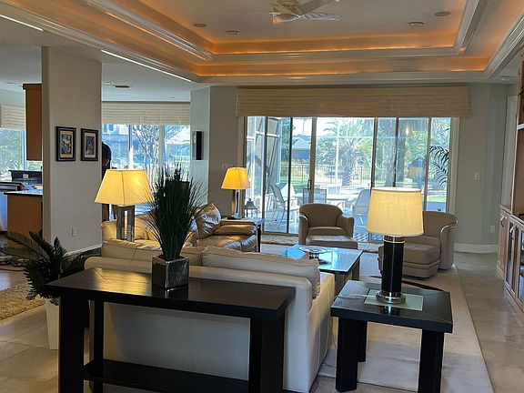 Fabulous Golf Course CUSTOM BUILT home located in The Peninsula. A gated Bay front community. Home is being offered furnished and features high ceilings with tray lighting and surround sound in great room and master suite, solid core oversized doors (3.0), wet bar with sub-zero refrigerator. Large custom kitchen with custom cabinets with pass-through window to wonderful screened Lanai overlooking golf course. New roof being installed.Amenities and reserved items sheet on file. Add two club chairs and ottomans in great room to reserved items.