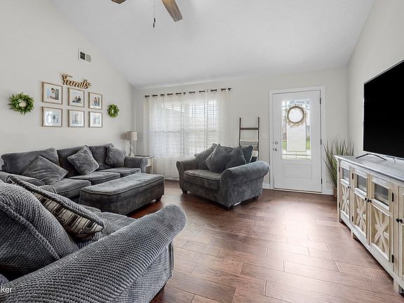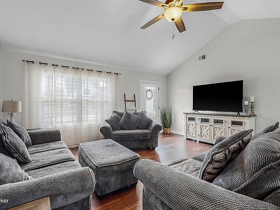 Like new construction without the wait! Plus lots of upgrades! This beautiful brick ranch is situated on a corner lot, with tastefully designed landscaping and side entry garage featuring 2 full size windows. The covered back patio will stop you before you make it in the door! Open concept living room and kitchen, with upgraded island, granite, and pantry cabinet. Engineered hardwood flooring throughout the entire home. Custom closet system is present in the primary bedroom closet, double vanity with marble top, tile flooring, and tray ceiling round out the primary suite. The kitchen also features beautiful white cabinetry, like new black stainless LG appliances, and tile backsplash.