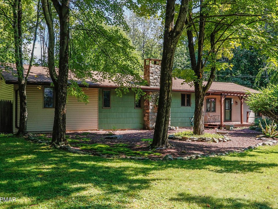 A home like this doesn't hit the market very often! 121 Matterhorn Road offers a contemporary flair with one floor living with its 3 bedrooms and 2 full bathrooms. As you enter the front door, you'll notice the sizable 23x21 living room, with high ceilings and a gas fireplace. The galley kitchen has granite countertops, tile backsplash, and stainless-steel appliances. Through the kitchen is a large dining room with a fireplace, perfect for hosting holiday meals. The spacious master bedroom has newer carpet and a master bathroom. The two other bedrooms have engineered hardwood floors. The sunroom offers desirable extra living space. Large pantry and a laundry room wrap up the interior. Through the back doors, you go out to the two-tiered deck and fenced in backyard with an additional side