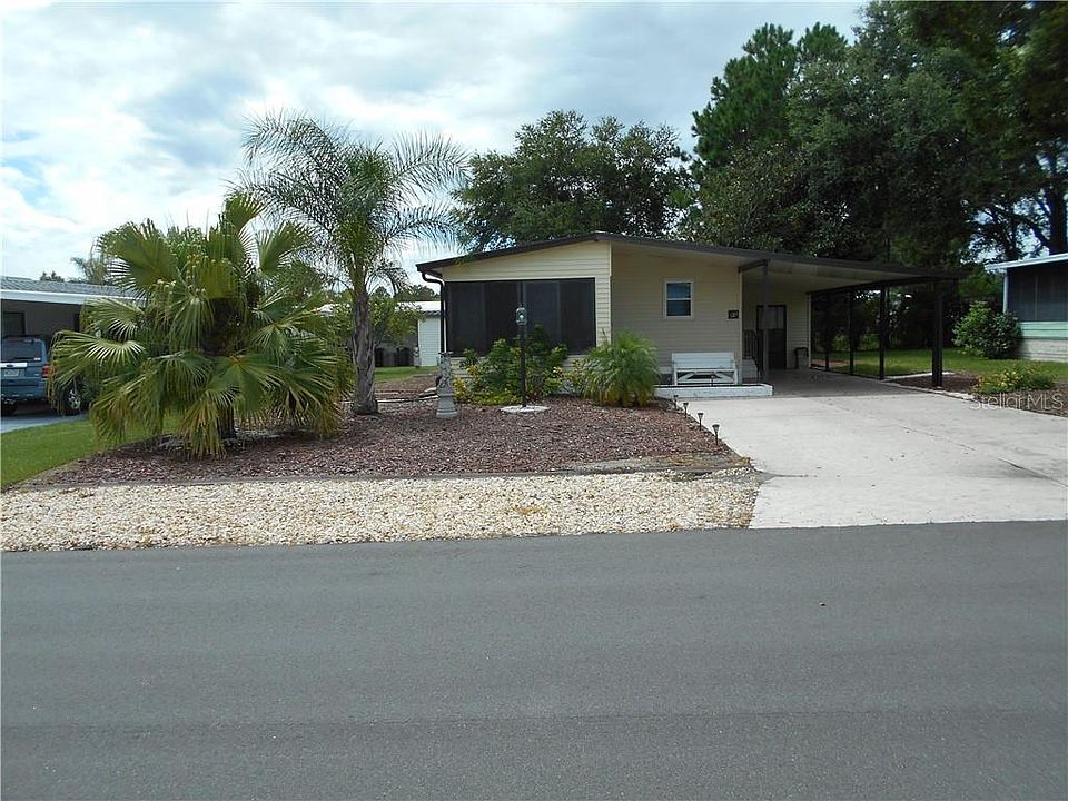 55+ Community - Nice two bedroom/two bath unfurnished home in a great community with $45/mo HOA fees and YOU OWN THE LAND. The painted driveway has room for 3 cars. Enter through the side door to the dining area with built in china cabinet and to your left is a nice front facing kitchen and a waist high cabinet great for entertaining. From the living room, open the sliding door w/built in blinds to the Florida room with acrylic windows, a wall a/c and river rock flooring. (You can see the Disney fireworks from this room). The two bedrooms are nice sizes and the master offers a walk-in closet. The utility shed houses the washer, dryer, and soaking sink along with lots of storage cabinets and shelves. This home also offers Xeriscape landscape, newer double paned tilted windows, and was replumbed by previous owner. The porch roof was replaced in 2018. The shed roof is newer metal with insulation. Polo Park offers two heated swimming pools, tennis courts, shuffleboard, horseshoes, pool tables, Bingo, and an active neighborhood watch. This community is close to Disney, Margaritaville, 429/27/192/I-4. Come take a look!