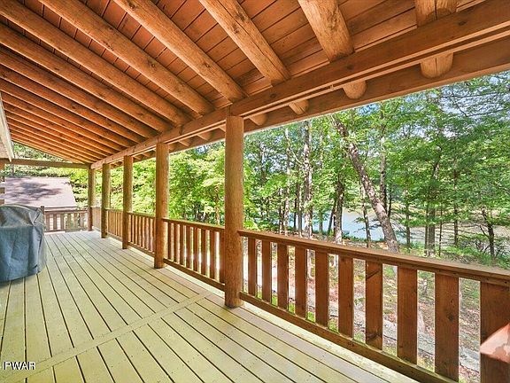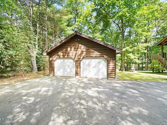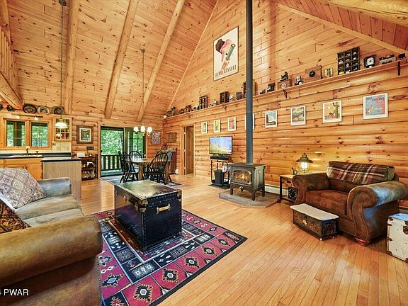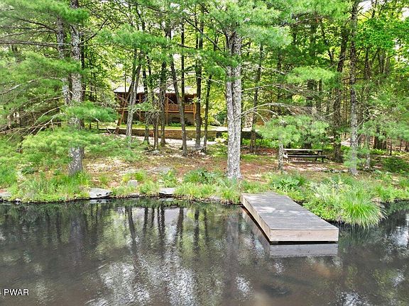Paradise Found! Large Lakefront Log Cabin with a picturesque and private setting, only minutes away from Milford Boro, PA! Step inside from the warm, welcoming front porch and the soaring ceilings and gleaming logs will take your breath away. The Living Room has hardwood flooring and woodstove and is open to the Dining Area and Kitchen for wonderful entertaining space. The First Floor has two Bedrooms, including a huge primary bedroom w/ closets galore, a lovely full bathroom, and an en-suite guest bedroom w/ private bathl. Covered back deck access w/ lake views is the perfect place to just relax, watch the water and listed to the wind. The upper level space can be used as the third bedroom or a loft area perfect for an office, complete with its own full bathroom. There is also easy access to a large amount of attic storage space! The spacious lower level offers a HUGE family room, laundry room w/ storage & multiple utility rooms. This 1.06 Acre property features 189' of level lakefront access, stone walls, large rock outcroppings and is a nature lovers dream. Complete with a two car detached garage and paved driveway, this home is move in condition and ready to enjoy! DV Schools and located near the center of everything.
