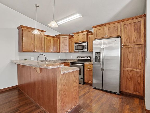 Be charmed by this 4-bedroom, 2-bath twin home conveniently located in the Stonebridge Farms Community. There's plenty of space for you to spread out and relax with vaulted ceilings and open layout. In the kitchen you'll find stainless steel appliances - sleek, shiny, and ready to elevate your cooking game along with staggered height cabinetry, under mount sink, pantry with rollouts and a snack bar. The dining room is open to the living room and has sliding door to the deck featuring new paint and carpet. There are two ample sized bedrooms- one has hollywood access to the bathroom which makes it perfect for the primary bedroom. Down in the daylight basement is a large family room, laundry/utility room, 2 additional bedrooms and full bathroom. Amenities include fenced yard with fire pit, 24X24 garage with floor drain along with easy access to Minot Air Force Base & 52 By-pass. Stonebridge Farms Community includes jogging and bike paths, open parkways, playground and picnic areas.