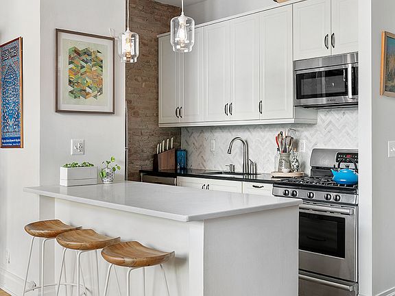 Perched atop the gardens of Cobble Hill awaits this gorgeously designed duplex home with serene outdoor terrace. Situated in former life preserver and ring buoy warehouse, this unique, top floor home boasts extra tall ceilings and an abundant amount of light creating an airy and bright feel throughout. As you walk into this mini-townhome you'll be met with views of the sky and outdoors through floor-to ceiling windows spanning the width of the living space. An open kitchen and dining area is ideal for entertaining as is access to a large, private terrace. The kitchen features a large breakfast bar and is replete with stainless steel Bosch appliances, marble herringbone backsplash, Caesarstone countertops, and clean lined cabinetry with ample storage space. The living and dining room are spacious and feature a wood burning fireplace to keep things cozy in the winter and an elegant, custom bar with wine fridge completes the space. Original details remain in the exposed brickwork through out which add extra charm and warm to the home and the staircase has been reconfigured to create a more modern and functional design with hidden storage space and a large closet underneath. On this level you also have a completely renovated and large half bathroom adorned with penny tile flooring and lovely stained glass door. Just outside the bathroom is a conveniently concealed Bosch washer/dryer with an adorable landing area perfect to keep things neat and organized upon entry. Upstairs you will find two bedrooms and two more full bathrooms. Both bedrooms get plenty of natural light through windows and skylights. The primary bedroom is spacious with a solid amount of storage and more exposed brickwork. A convenient on-suite bath is nicely appointed and features a shower and custom vanity and large medicine cabinet for extra storage. The secondary bedroom is also large and comes with a massive walk-in closet and the second floor of the home is completed with an additional full bathroom. The location of 121 Pacific Street perfectly marries convenient access to all amenities along Atlantic Ave and Court Streets and all the charm of quaint Cobble Hill. The co-op has two elevators, offers a live-in super, Butterfly Virtual doorman system, common roof deck with city views, and two entrances, one of Pacific and one on Atlantic. Enjoy the waterfront of Brooklyn Bridge Park which is a quick jaunt and the nearby 2,3,4,5,F,G, and R make any commute easy. *Actual maintenance listed, but owners take advantage of a yearly rebate*