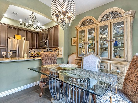 Nearby is the powder room with a unique vanity, quartz countertop and marble sink. Step down onto luxury vinyl flooring, upgraded baseboards and into the the kitchen where you will find custom espresso cabinets an exquisite travertine apron sink, stainless steel appliances, granite countertops with a travertine backsplash with bronze accents and a breakfast bar.