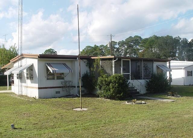 Spacious dwmh on corner lot in community near golf course and the St Johns River; carport, covered patio, laundry/storage room, storage shed, screened front porch, window awnings. Inside large master bedroom with 2 closets, vanity area, water closet, walk-in shower, plus 2nd bedroom and full bath, large living room, separate dining room, kitchen with plenty of cabinets, dishwasher, stove, water-ice dispenser refrigerator, and large family/game room. Hall floor needs some tlc. Great getaway or year-round location.
