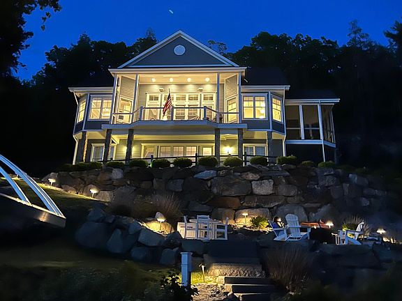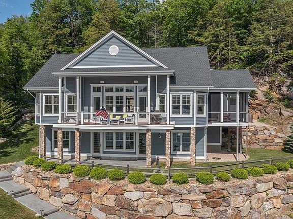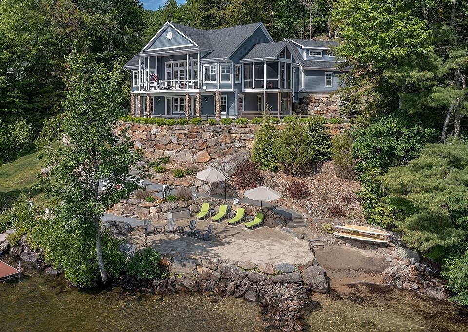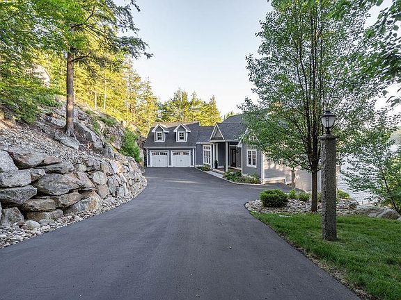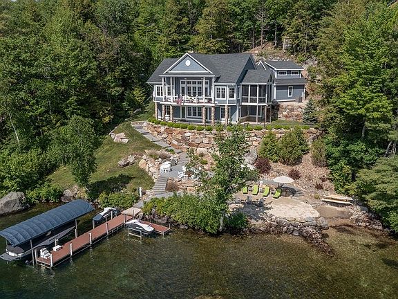 Exquisite Winnipesaukee home on 234' of west facing waterfront in Meredith Bay on over an acre of private beautifully landscaped property. No expense spared in this home where you will find exceptional quality and a fabulous floor plan with 10-15' ceilings throughout. Amazing views of the lake from almost every room. A true gourmet kitchen with high end appliances, a large island great for entertaining, an open dining area and living room w/dramatic floor to ceiling fireplace. The main level has a spacious en-suite primary bedroom, large deck, mud room with custom built-ins, large walk-in pantry, cozy den, private office and huge bonus room which is great for overflow guests or a kids space. In addition, there is a large screened-in porch. Lower level has three bedrooms, (1 is an en-suite), a bunkroom, laundry room and a large family room that is ready for a wet bar. The outside, like the inside, has many places to sit, enjoy the views and water activities. Each level has electricity & water including an outdoor shower station and a sandy beach walk with paddleboard/kayak rack ready for a morning paddle. One patio has a fire pit area & an outdoor mini fridge. Deepwater 6x40' dock has a great space for more than one boat and the possibility to add a second dock. An area to possibly construct a garage or use for parking overflow in addition to a parking area & shed at street. Don't miss out! Delayed showings begin Monday 5/27.
