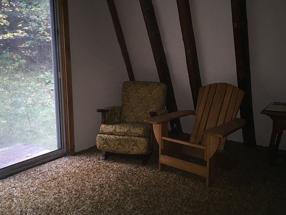 Sweet little get away and perfect hunting camp. This A Frame nestled in the woods, surrounded by thousands of acres of state land, has it all. It is totally set up to run on propane with propane refrigerator, hot water heater, lights, and stove. OR It has a wonderful little outbuilding to house you generator and wired underground to the camp to run electric, it is also wired inside with lights and outlets. It has a drilled well with submerseable pump, and pressure tank. The A Frame has 3 levels, first floor has kitchen, bath, sitting room and wood stove, Second level has 2 rooms each with sliding glass doors for great views. 3rd level consists of 2 bedrooms. outside is a nice storage shed.