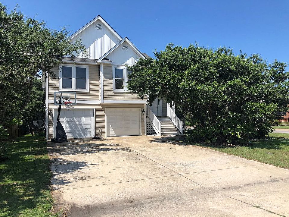 You will fall in love with this impressive and generously spacious residence. The perfect home to raise a family and entertain friends. The award winning floor plan is ideal for primary or vacation living. This beautiful home was featured in the Outer Banks Parade of Homes and won an award for best use of space for its ideal floor plan for primary or vacation living. This home has been well maintained by the original owners. The main floor hosts a bright and spacious living room with hardwood floors and built in bookshelves and custom cabinetry, cathedral ceiling, open tiled-floor kitchen, and dining area. This floor also contains master suite with walk in closet, huge jetted garden bathtub and ceramic tiled shower. This floor is complete with 2 additional bedrooms, full bath and conveniently located laundry. The lower level has a huge game room/den, 4th bedroom, full bath and leads to the spacious finished double car garage. Exit on this level through the sliding glass door to the patio and beautifully landscaped, fenced in backyard that is nestled against the serene backdrop of the wooded, historic Wright Brothers National Park. This home's location is central to everything in the Outer Banks and located just a few blocks to the ocean. Perfect for anyone, this home is ideal for year round living, a 2nd home or a vaction rental.