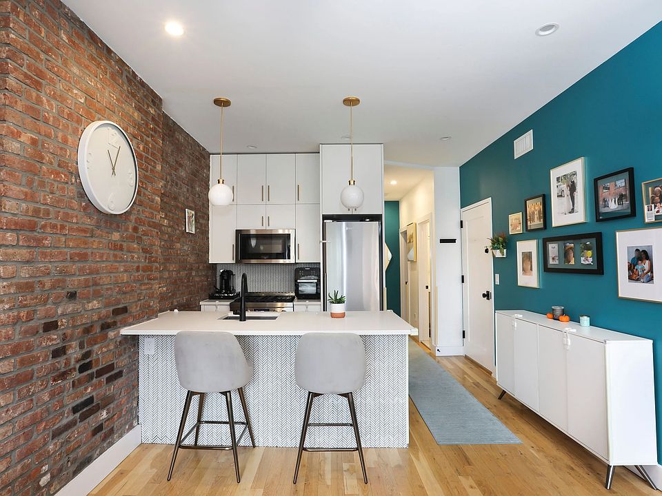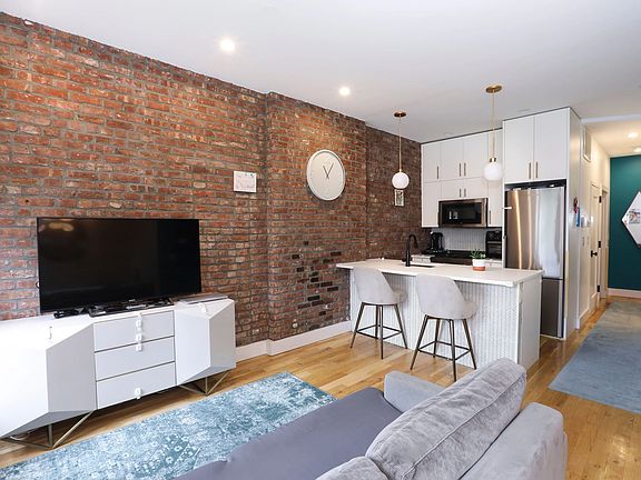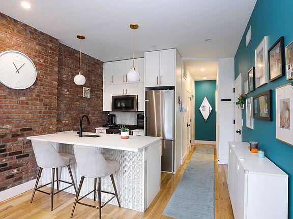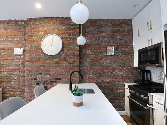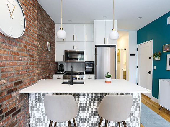 Converted in 2018, this newly built condo embodies aspects of traditional brownstone living with a modern aesthetic. Everything was upgraded from soup to nuts- new plumbing, wiring, insulation, soundproofing, central AC and heating with no stone unturned. Two flights up from stoop, the apartment has a landing before you enter. As you open the door you a greeted by beautiful natural sunlight from the oversized windows along the front wall. The kitchen is fully dressed with custom wood cabinetry, quartz countertops, stainless steel appliances, and a large center island anchoring the room. The exposed brick wall, ties in the old world charm with modern luxury. The top floor unit is the only unit with a dining nook, perfect for a breakfast table or even to situate your living room. The options are endless! Head down the hall to your modern sleek full bathroom, and laundry room with storage. The bedrooms are located in the back of the building for privacy. Both the primary bedroom on the left and the secondary bedroom have full ceiling height for maximum storage closets. Speaking of storage... there is a LARGE 5ft X 4ft private storage closet in the basement. Enjoy being in prime Carroll Gardens & everything it has to offer. Lucali, Mazzola Bakery, Mozz Lab, Brooklyn Farmacy, Key Food on Henry, & 3 blocks to F train... in the heart of it all!