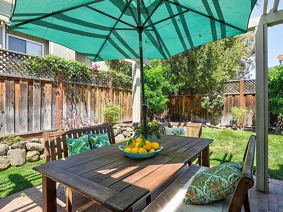 End unit with two master suites, open living/dining area, high ceilings, plantation shutters, fenced backyard with patio, lawn, planting beds, and pergola. Eat-in kitchen with newer gas cooktop, oven, and microwave. Half bath on the first floor. Upstairs laundry. Hardwood floors throughout most of the home. Attached 2 car garage with extra storage. A/C. Great floor plan for entertaining, feels like a single-family home!