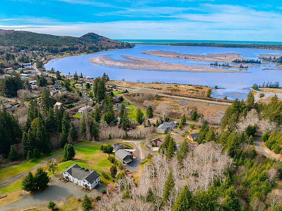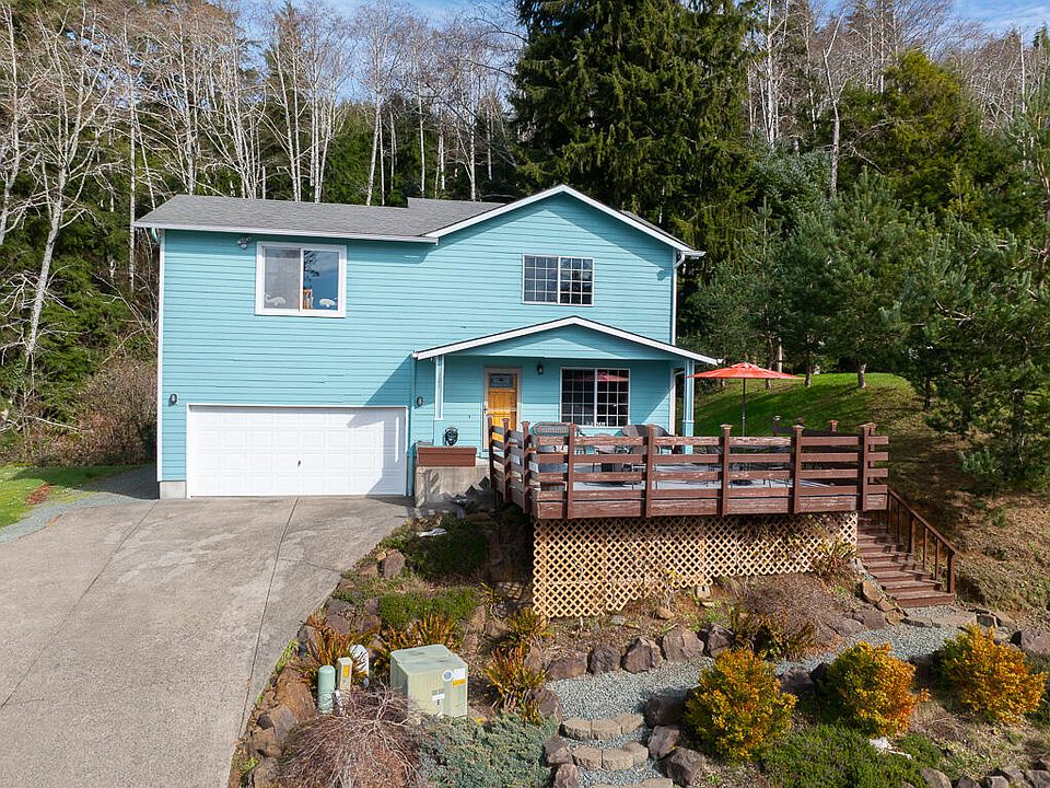 Forest serenity with a view! Spy Nehalem Bay and coastal sunsets from the front deck and upper bedrooms of this spacious open-concept home on the north edge of Wheeler. Bursting with character at every turn, you'll love the abundance of wood detailing and stunning granite tile and countertop work in the designer kitchen. All 4 bedrooms are upstairs, including the comfortable primary ensuite. The fireside living room, forest back drop and a babbling brook off the private back deck add a sense of tranquility to the home. Got toys? Plenty of room in the garage to stow them!