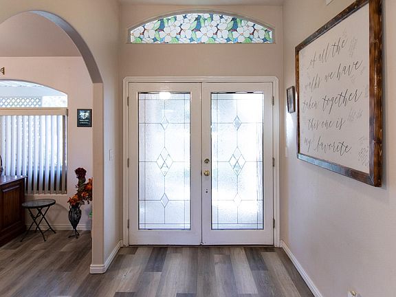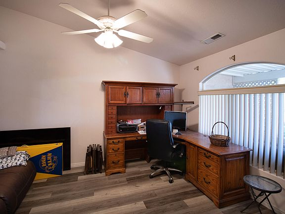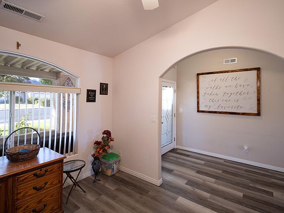 Beautiful home with mountain views, gas firepit, two covered patios, lighted fountain & area for cornhole or horseshoes! Fully fenced backyard, lovely mature landscape with plum, fig, loquat, & almond fruit trees. Sandbox with cover. 3 bedrooms PLUS a den. LVP flooring, vaulted ceilings, jetted tub, garage cabinets, & workbench. Near schools, mall, box stores, golf course, university, parks, etc. The listing broker's offer of compensation is made only to participants of the MLS where the listing is filed.