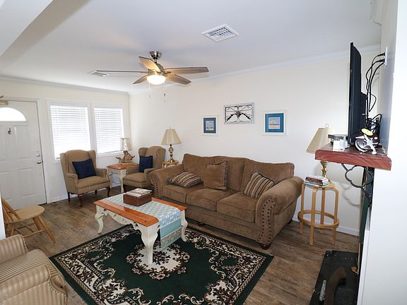 Expanded and remodeled waterfront home with newer vinyl bulkhead and newer dock. Beautiful wood-look tile floors throughout. Spacious rooms. Great open floor plan. New kitchen with all new cabinets, counters, and appliances. Oversize bath with jacuzzi tub and tile surround. Laundry in bath. Ceiling fans in all bedrooms. Gas fireplace in great room. Freshly painted. Low maintenance exterior. Two generous storage sheds. Fire pit. Sliders open to large patio. Rear deck near lagoon. Vinyl Bulkhead. 6' x 20' floating dock. Newer heat and air. Newer hot water heater. Plenty of off street parking. Quick boat ride to the open bay. Just move right in!