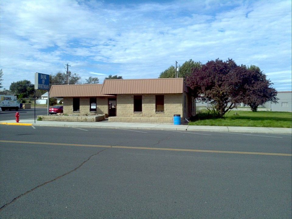 Formerly the Bank of Whitman, location on a busy corner across the street from a grocery store and across from US Bank.