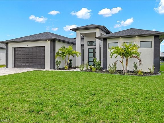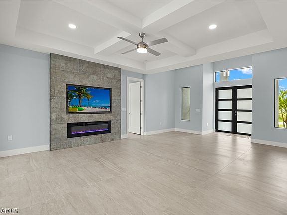 STUNNING New waterfront, pool home loaded with high-end designer finishes! From the elevated coffer ceilings to the custom Built-In fireplace with mounted 65” flat screen TV, this home is nothing less than impeccably done with Ultra modern color scheme and finishes inside and out! Upgraded stainless steel appliances, quartz countertop with waterfall edge! 24 x 48 modern porcelain tiles throughout! Walk-through shower with designer tile and modern free standing tub! Double sets of pocket sliders in the great room area! Huge under Truss lanai with beautiful pool and extended paver deck for lots of sunning area!!! Very large pantry/storage room right off of kitchen can be used for pantry or owners storage if you use this as a vacation rental. Beautifully appointed pool bath with designer tile. New seawall, auto sprinkler system with beautiful landscaping. Incredible neighborhood close to everything with new homes surrounding and a quiet street! 10 minutes to Cape Coral Beach, Close(two minutes) to shopping, 15 minutes to waterfront dining areas and entertainment! NOT IN A FLOOD ZONE!! This home is an absolute must see!! Please check out the 3-D tour!
